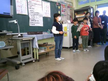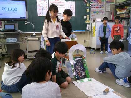今日は、店当番やお客さんを交代しながら、家の人と一緒におもちゃランドを楽しみました。司会やはじめの挨拶、ルール説明、おもちゃの遊び方説明、終わりの挨拶、インタビュー等、いろんな役割にも挑戦しました。来週は1年生を招待します。やる気満々です!