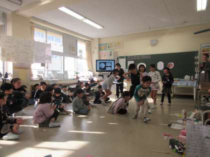 2年生は、生活科の学習で作った動くおもちゃで遊んでもらう「おもちゃランド」を行いました。これまでの作る過程では、自分で試したり、友達に遊んでもらったりしながら、改良を重ねてきました。この日は、おうちの人にも遊んでもらって、嬉しそうな子供たちでした。