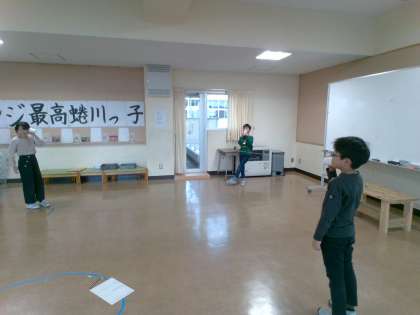 理科では、糸電話を使って音を伝えるもの(糸)が震えているのか実験しました。また、3人や4人で糸電話をするにはどうしたらよいか考え、協力して試していました。