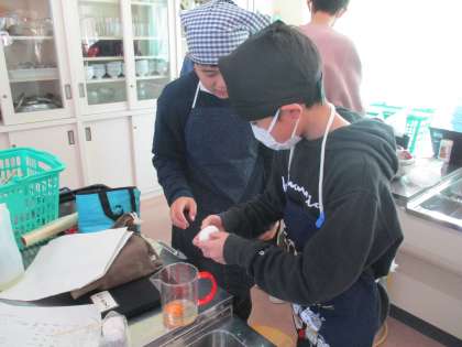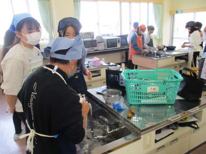 家庭科では、夕食の1食分の献立を考え、そのうち一品を試しに調理しました。今回は一人一人作りたいものが違いましたが、班の仲間と声をかけ合いながら美味しく作ることができました。