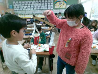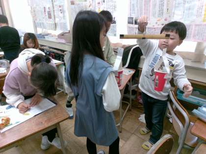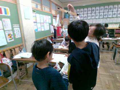 今日は算数の時間に重さくらべをしました。持っただけでは分かりにくい重さも、道具を使って傾きを調べれば分かることを確かめました。