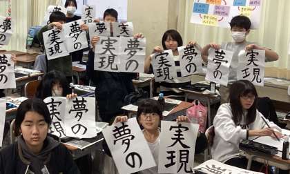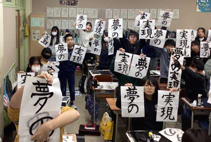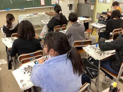 「夢の実現」という言葉にチャレンジしています。今まで習ったことを思い出しながら、一文字一文字確かめながら書いています。始まったばかりなのでまだ書き慣れていないところも多いですが、年明けの本番に向けて頑張ってほしいです。