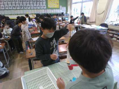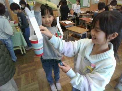 算数科の学習では、天秤を使って身の回りの物の重さ比べをしました。傾き方に注目し、下がっている方が重いことを体感を通して理解しました。自分たちで磁石何個分と釣り合うか調べるなど、主体的に学ぶ姿が見られました。