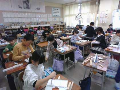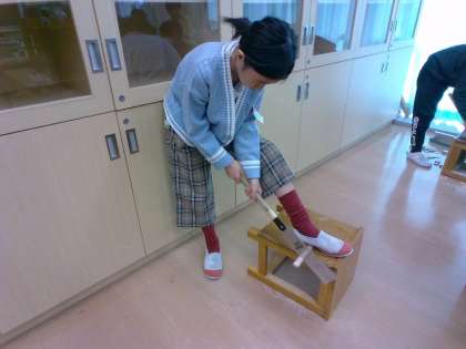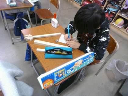 のこぎりを使って木材を切り、木材をつなぎ合わせて色々な生き物を作っています。初めてのこぎりを使用して行う作業に緊張しながらも集中して取り組んでいる様子が見られました。