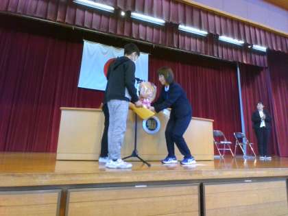 その後、離任式が行われました。3年生の子どもたちもとてもお世話になった加藤先生に、代表児童がお手紙を読み、花束を渡しました。