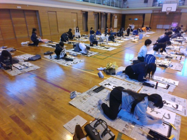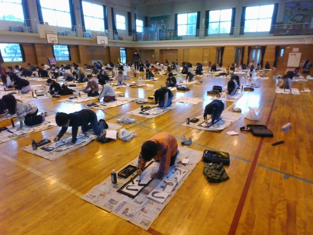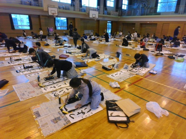 今日の2時間目に、体育館で書初大会を行いました。子供たちにとって、毛筆での書初大会は初めてでしたが、一画一画に気持ちを込めて、丁寧に書く姿が見られました。