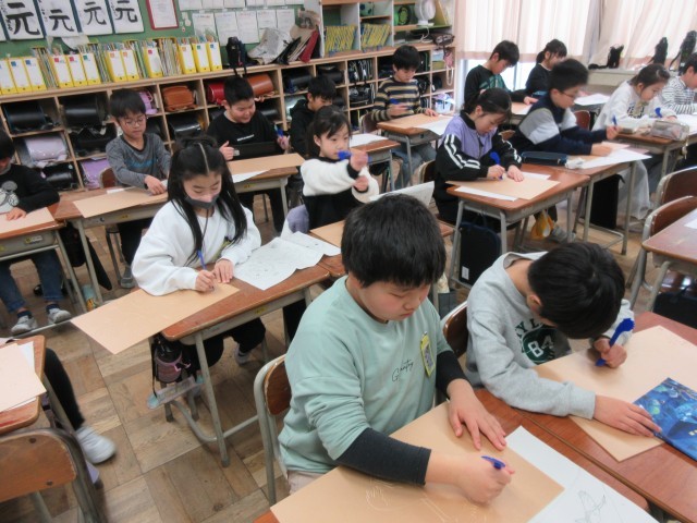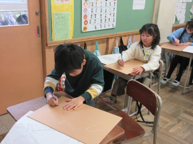 最中の皮みたいな材質に、いろいろな飾りが付いたへらで、思い思いに描きたい動物や植物を表現していきました。夢中になって取り組んでいました。来週の図画工作科の時間は、カラーインクをローラーで塗って版を刷ります。どんな線が出てくるのか、楽しみです。