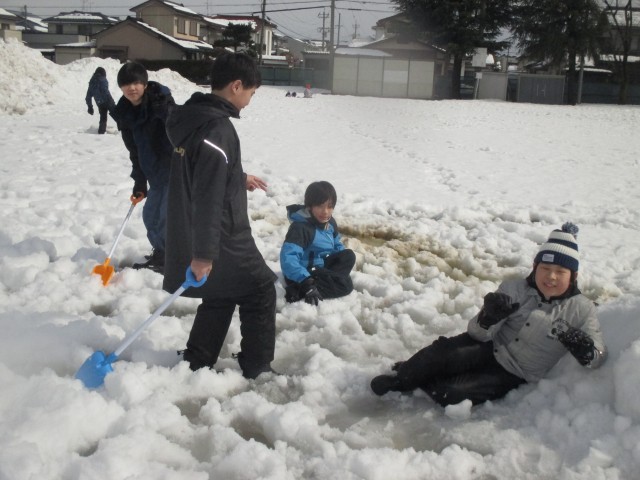今日は、グラウンドで雪遊びをしました。あいにくの天気でしたが、子供たちは、雪だるまをつくったり、そりで滑ったりして大はしゃぎでした。