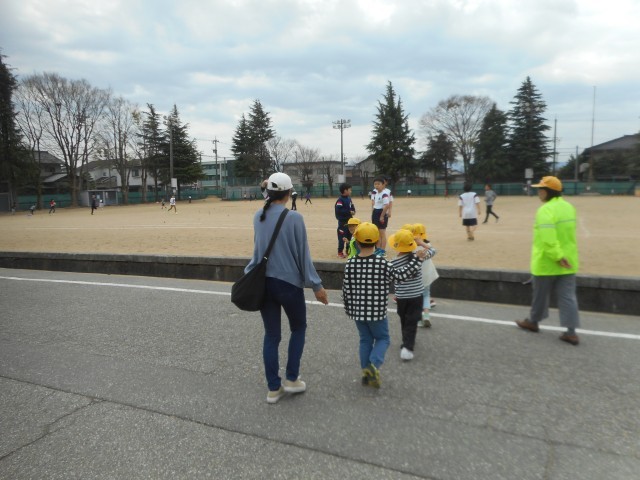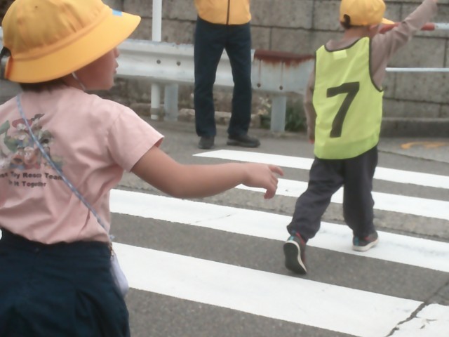 交通安全についての話を聞き、実際に道路を歩くことにより、道路の正しい歩行や横断の仕方を身に付けるため、警察や交通安全協会の方に教えていただきました。