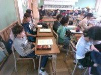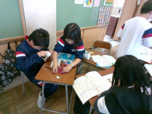 直方体と立方体の大きさについて積み木をしきつめて比べました。グループで協力しながら問題に取り組んでいます。