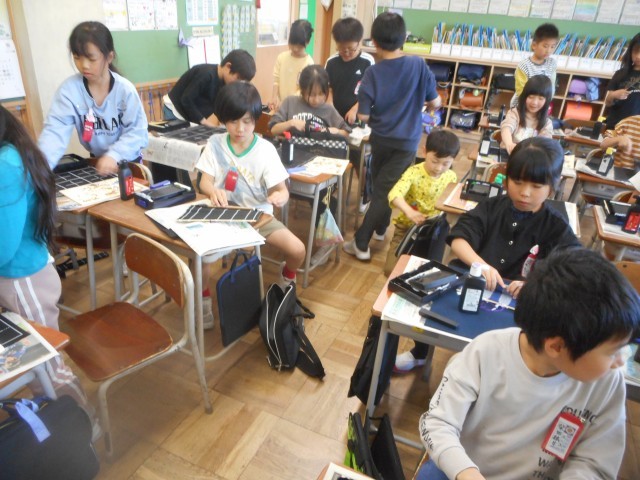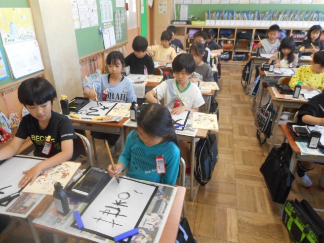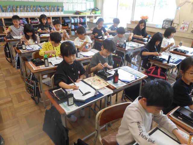 書写の時間、初めて筆に墨をつけました。準備の仕方、筆の持ち方等を確認し、いよいよ筆に墨をつけ文字や絵を自由にかきました。鉛筆とは違う持ち方に戸惑いながらも、思い思いに筆を動かしていました。その後は片付けです。墨をこぼさないように気を付けながら、手際よく片付けることができました。来週から、いよいよ本格的に練習が始まります。