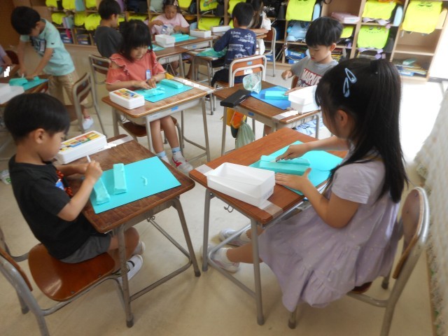 「ケーキだよ」「お寿司だよ」と好きな食べ物をつくっている子供たち。「水中めがねから恐竜に変わったよ」と作品を変化させている子供たち。つくったものを見合って、楽しんでいました。