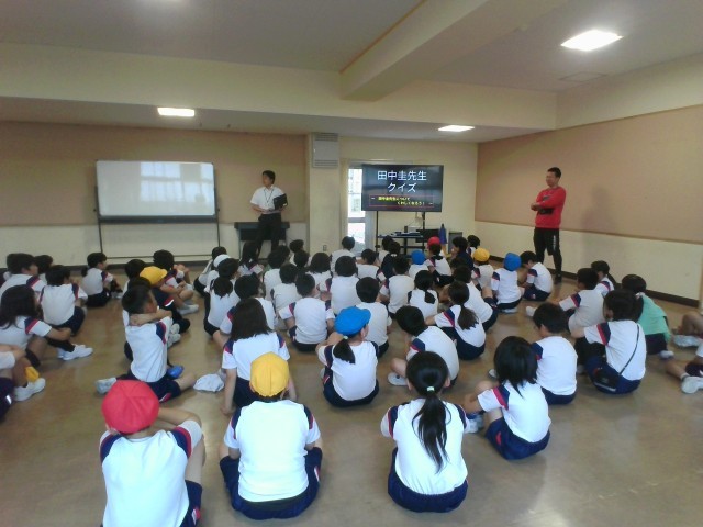 朝学習の時間に、新たに4年4組に担任として入った田中先生の紹介を行いました。子どもたちは楽しみながら田中先生のことを知っていました。