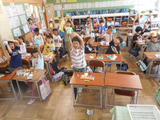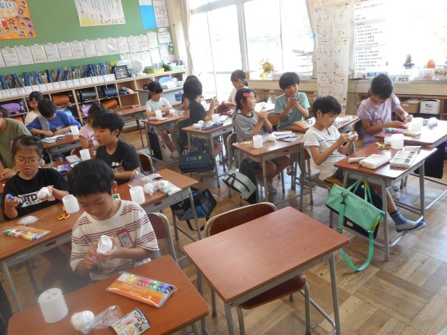 今日は、紙粘土に絵の具で色をつけ、自分のイメージに合うペン立てをつくりました。白い紙粘土を柔らかくなるまで十分こね、思い思いの色を混ぜていきます。「先生、見て!きれいな色ができた!」「はさみで傷をつけて、パイナップルをつくったよ」とみんな夢中になってつくっていました。5・6時間目が図工だったのですが、「先生、7時間目をつくってください!」と言い出す子も!来週続きをする予定です。