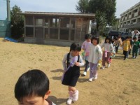 生活科では、グラウンドの探検に行きました。「広いね」と言いながら散歩していると、用務員さんに出会いました。最後に、遊具の約束を確認して、元気に遊びました。