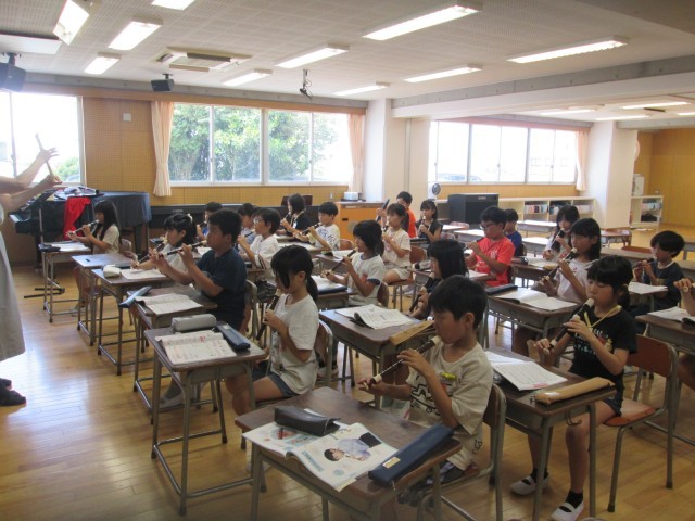 音楽では、リコーダーにチャレンジしています。息の強さを調節するのが難しいようですが、丁寧に吹いています。
