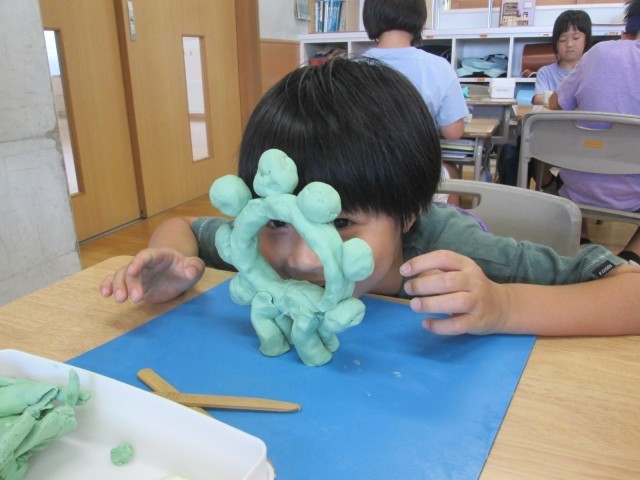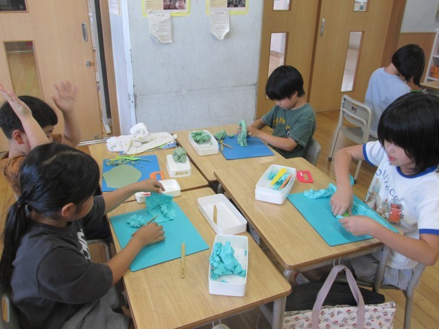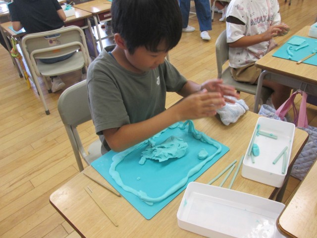 2学期最初の図工では、ねんどを使った作品づくりをしました。「こんな町があったらいいな」とイメージし、ビルやタワー、遊園地やお店などを作って楽しみました。
