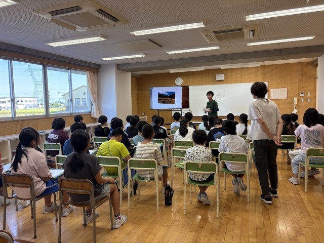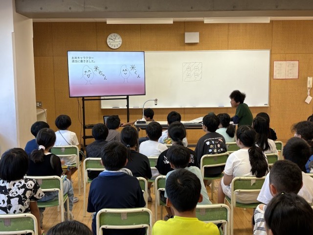 今日は、お米について出前講座をしていただきました。稲刈りまでの流れや今のもち米の様子を確認したり、今の自分たちの考えを伝えたりしました。