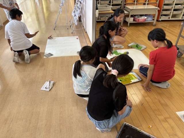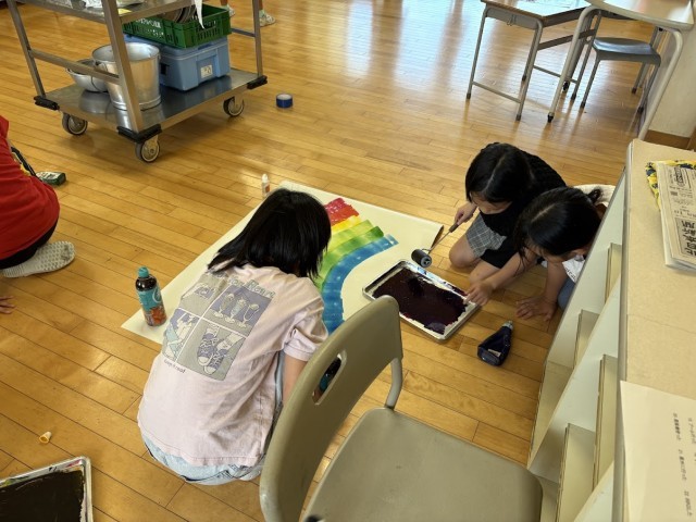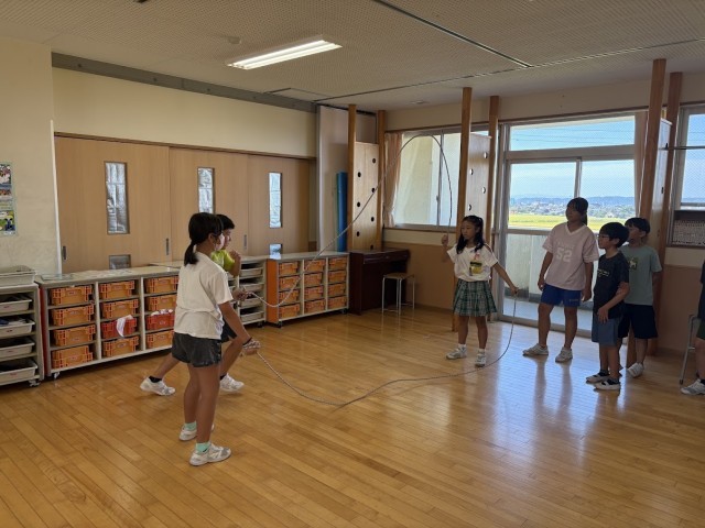 暑い日が続いていますが、5年生は元気に休み時間を過ごしています。今日は、ダブルダッチをしたり、大きな絵を描いたりしました。