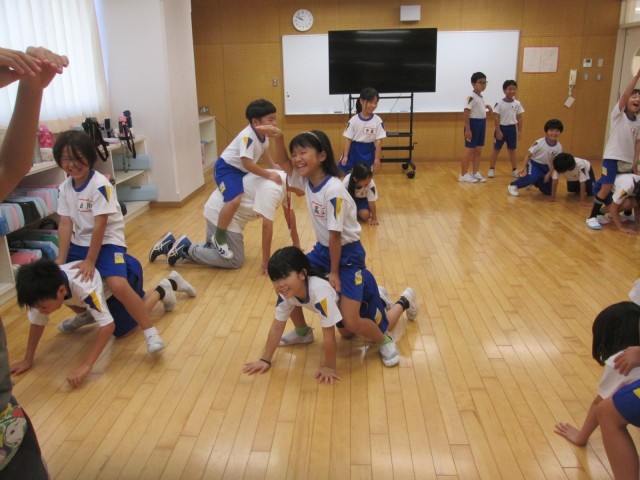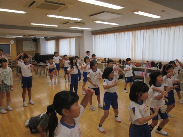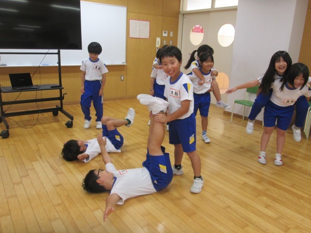 体育では、リズムダンスといろいろな動物になりきる表現運動をしました。二人組になって協力し、キリンやカンガルーなどの動物を表しました。次回は、乗り物になりきります。