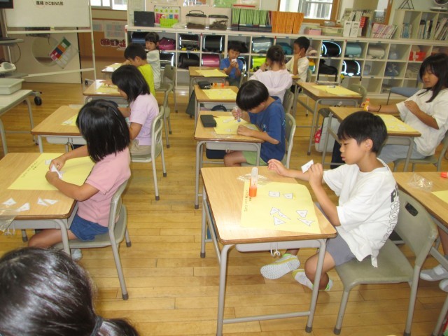 2年生 算数の学習 公開日 2025/09/08 更新日 2025/09/08 2年生 算数では、「さんかくやしかくの形をしらべよう」の学習をしています。実際に図形を使って2つのなかまに分けてみました。「この形はさんかくっぽいぞ」「大きい小さいで分けてみよう」など、考えながら分けていました。