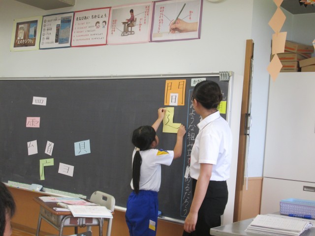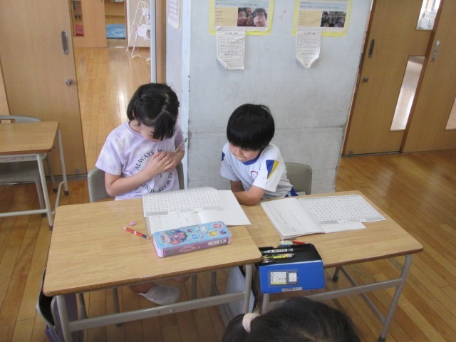 教育実習生さんと漢字の組み立ての学習の続きを行いました。漢字パズルや漢字探しの活動を楽しみました。