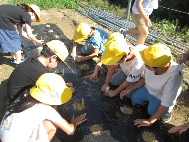 先週の金曜日に、だいこんを植えました。今日は、続きでだいこんをうえました。金曜日に植えただいこんには、芽が出ているものがあり、子供たちは驚いていました。また、収穫しただいこんは、「おでんにして食べたい」「つけもので食べたい」「みそしるに入れてほしい」など、楽しい話に