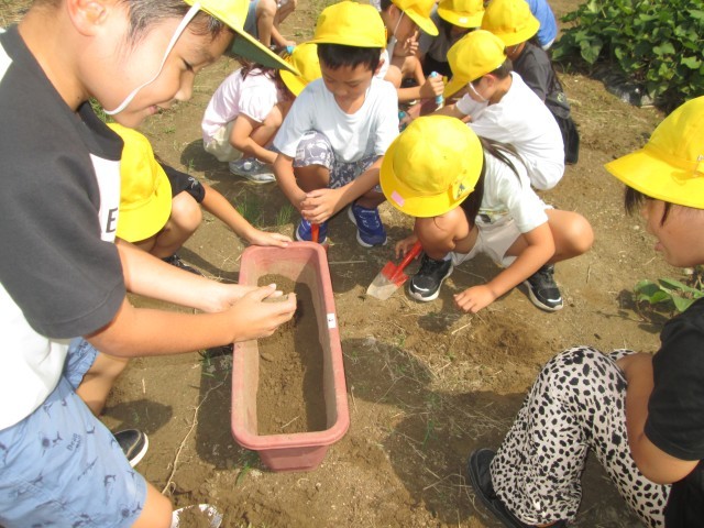 プランターにはくさいの種をまきました。畑の土をプランターに入れるとき、土の固さに子供たちは驚きながら、一生懸命スコップで畑の土を掘って入れました。その後、種を大事に持って植えました。はくさいは、色団ごとに育てます。芽が出てくるのが楽しみです。