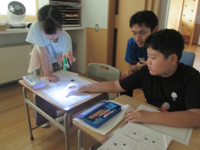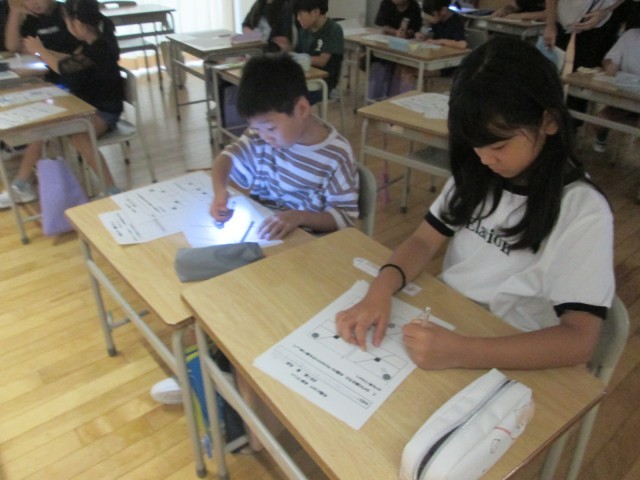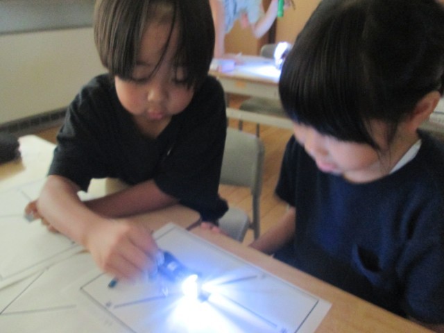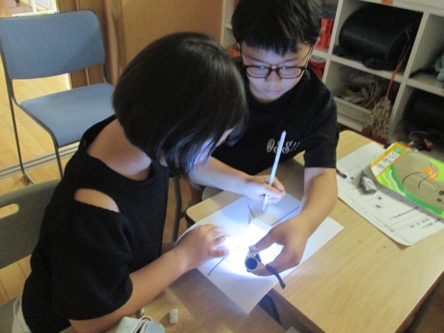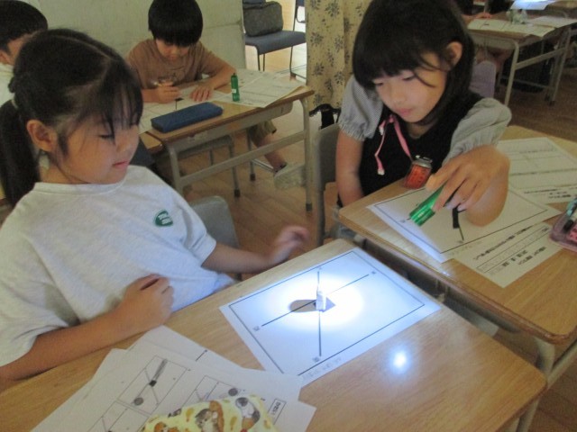 教育実習生の先生と、太陽とかげの関係について学習しました。先日観察したことを、ライトと消しゴムを使って確かめました。実際に光を動かしてみることで、かげのでき方を理解しました。