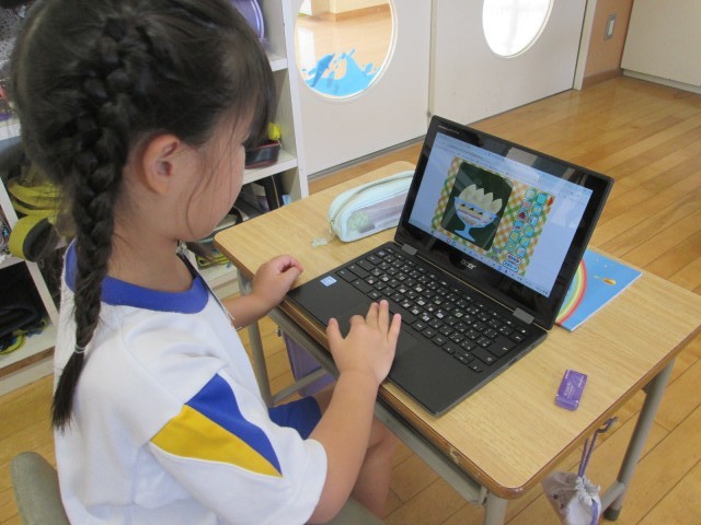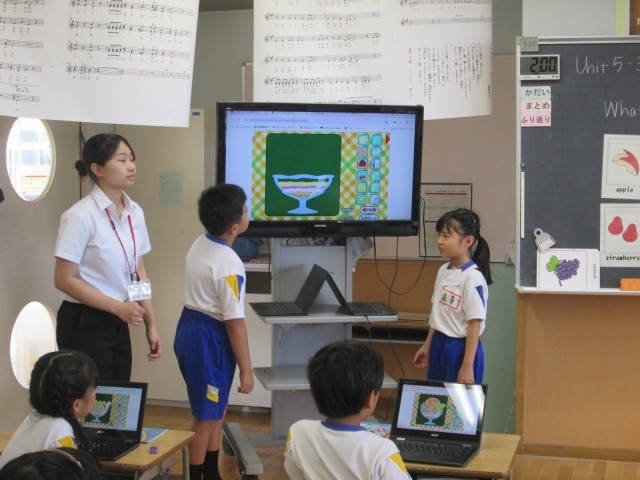教育実習生の先生と、’What fruit do you like?’の表現を用いて、好きな果物をたずねてパフェを作る活動を行いました。クロムブックを使って、いろいろなフルーツやアイスクリームをのせたNice parfaitになりました。