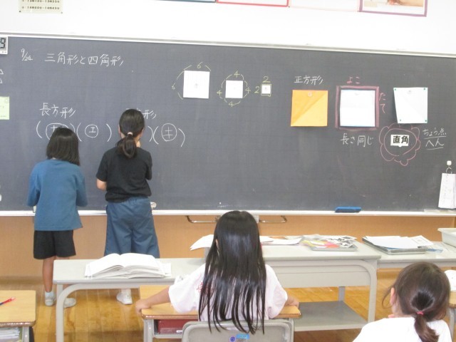 2年生 算数の時間 公開日 2025/09/24 更新日 2025/09/24 2年生 算数では、今日は正方形の特徴について調べました。その後、クイズ形式の問題を解いたり、練習問題をしたりしました。長方形や正方形の学習も、終盤に入りました。楽しみながら、学習の理解を深めていってほしいです。