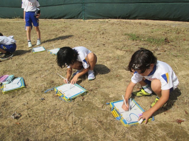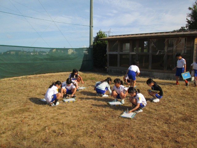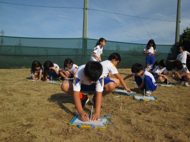 理科では、太陽の位置とかげの動きの関係を調べるため、朝からお昼まで観察を行いました。1時間ごとに観察をすると、少しずつ太陽が動いていることに気が付きました。