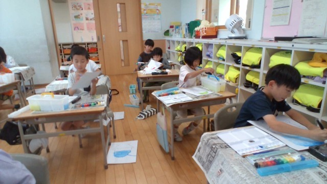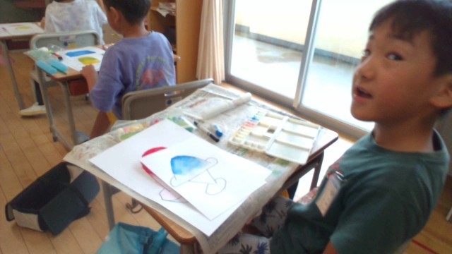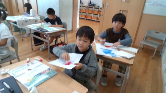 1年生は図画工作の学習で、今年初めて水彩絵の具を使いました。
