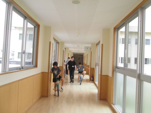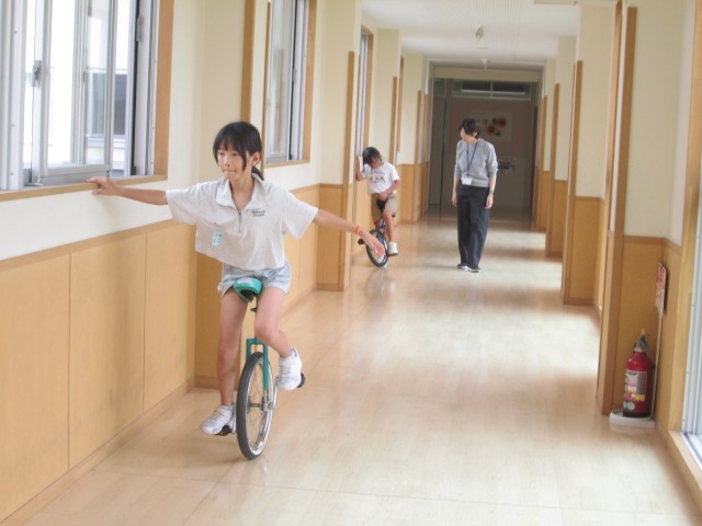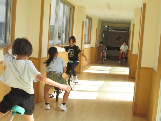 学習発表会にむけて、一輪車の練習をしています。初めてチャレンジした一輪車はバランスをとって乗ることが難しいのですが、「のれるようになりたい」という強い思いをもってがんばっています。今はうまく乗れないことが多いのですが、一人で練習、友達と練習、そして、5年生や3年生の乗れる人に教えてもらいながら取り組んでいます。