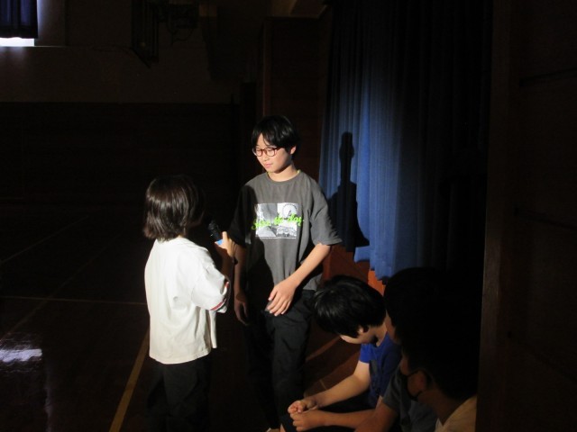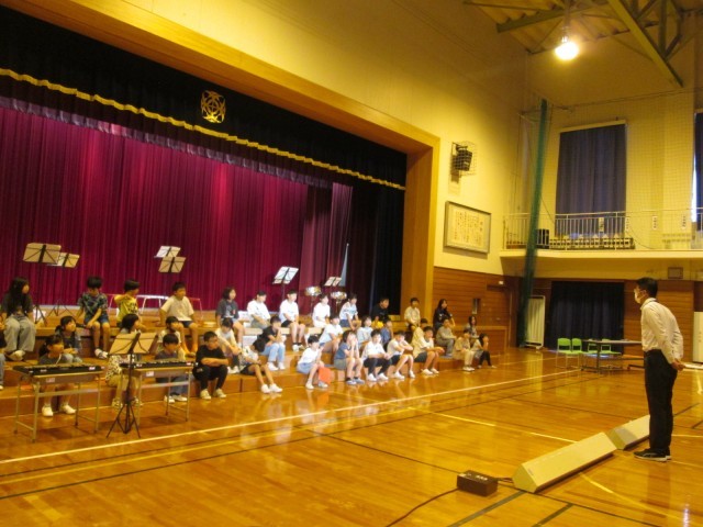 今日は、3・4年生の発表を教頭先生に見ていただきました。また、6年生の係の人に照明を当ててもらい、本番のように行いました。教頭先生からは、みんなで発表をつくり上げる意識をもつことが大切だと教えていただきました。2学年合同で人数が多いですが、心を一つにしてさらによりよい発表にしていきたいと思った子供たちです。
