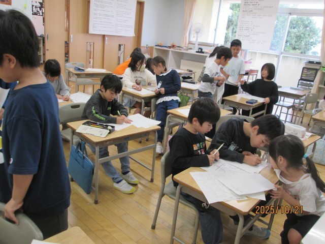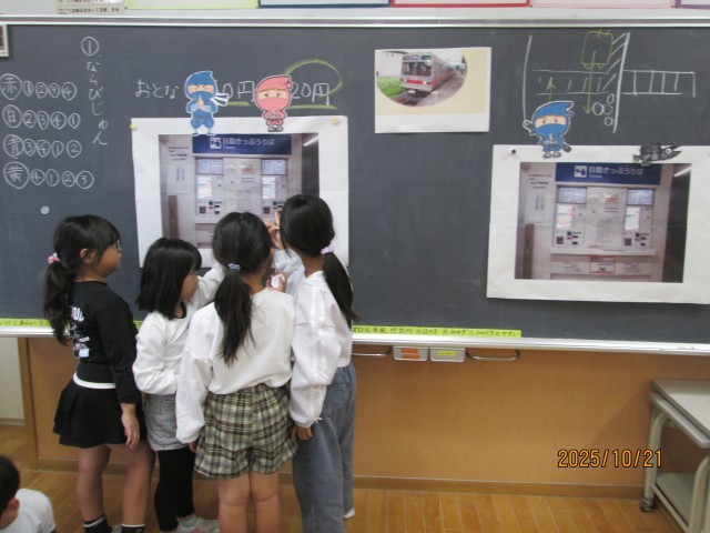 10月24日(金)の校外学習に向けて、2年生は1年生と縦割りで活動します。子供たちは、同じ班の1年生さんと仲良く活動するために作戦を考えました。班の中の並び順や班のめあてなど、事前に相談しました。その後、1年生さんも加わり、班のメンバーの顔合わせや電車に乗る時の自動販売機での切符の買い方も練習しました。校外学習が楽しみです。