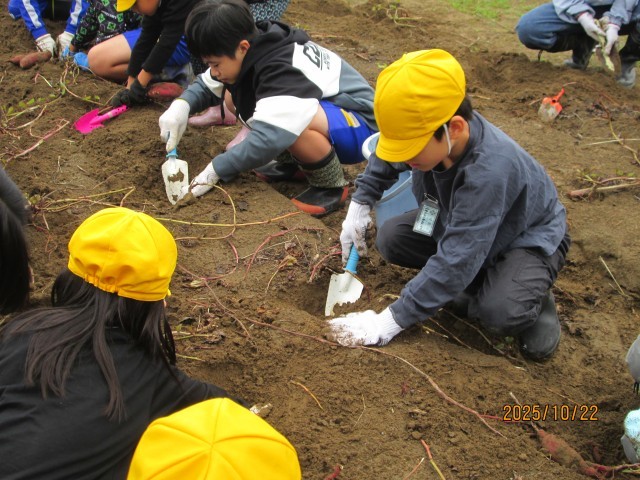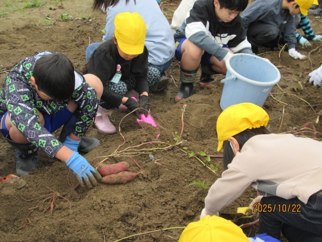 サツマイモを全校で収穫しました。大きすぎて、なかなかサツマイモが抜けません。とても楽しそうに活動していました。