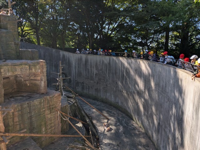 サル山を見学しています。赤ちゃんサルもいて「かわいい」と歓声が上がりました。