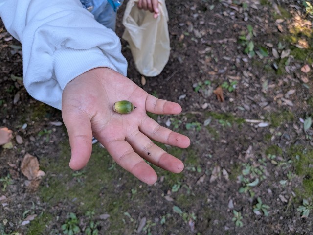 まずは、稲荷公園で「あきみつけ」をしています。落ち葉やどんぐりなど、秋がいっぱいです。
