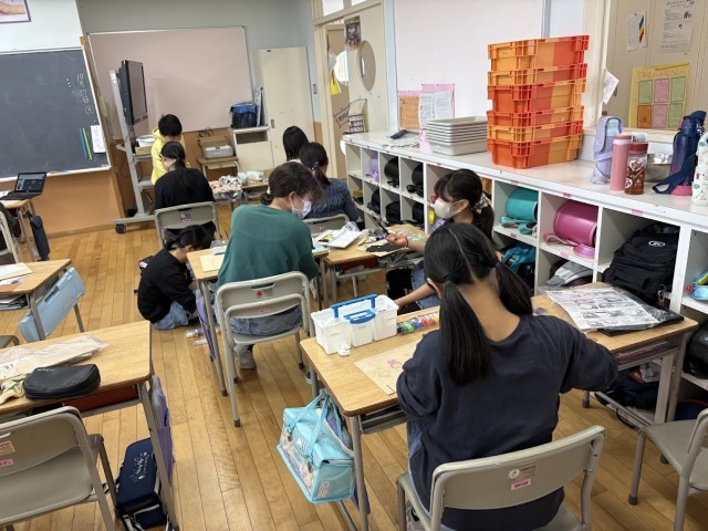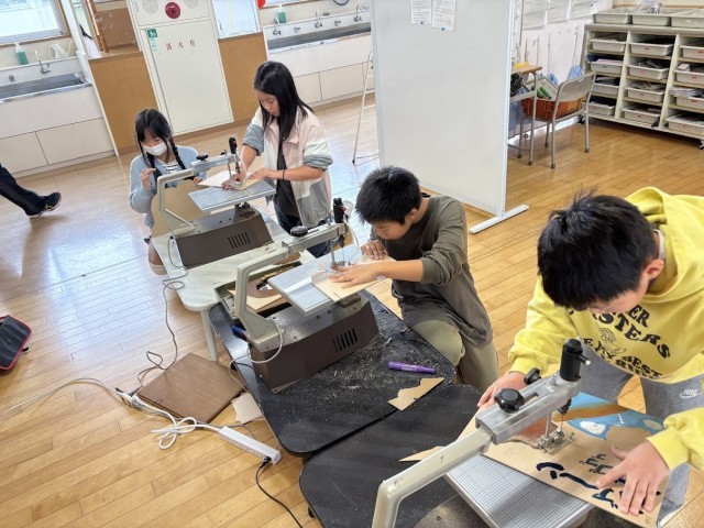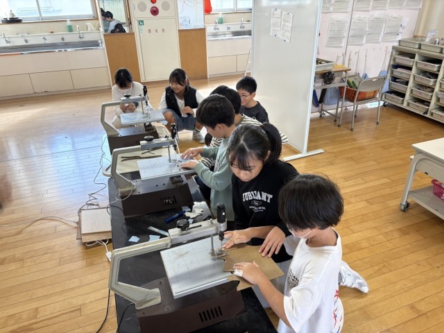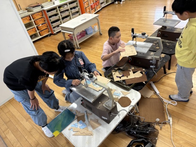 図画工作科では、糸のこを使った工作をしています。ホワイトボードかティッシュケースを選んでつくっています。