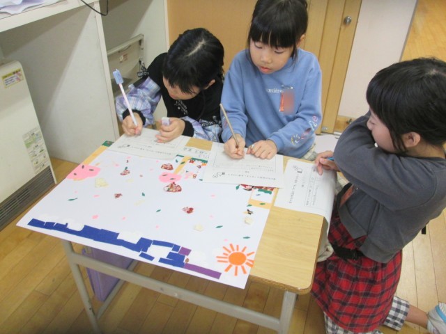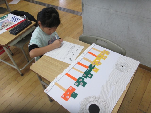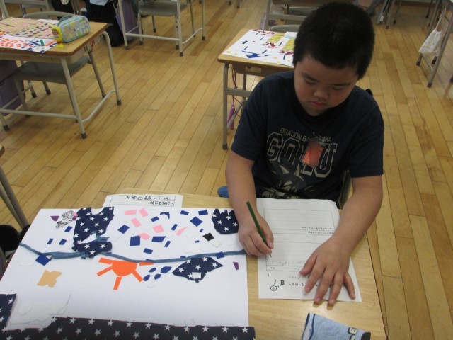 図工では、友達の作品のかんしょうを行いました。布のさわり心地や柄などの特徴を生かした作品ばかりで、あちらこちらで「いいね!」が飛び交っていました。11月の学習参観では、子供たちの力作をぜひご覧ください。