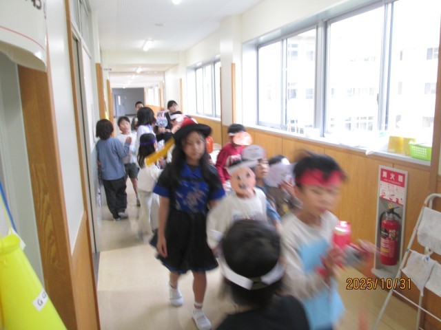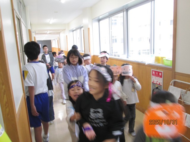 今日はハロウィン! 昼休みに、1、2年生は自分たちで作ったお面や飾りをつけて、ハロウィンパレードをしました。低学年の子供たちは、わくわく、どきどきしながら校内を歩きました。その様子を見て、他の学年の子供たちが、1年生の手を引いて歩いてくれたり声をかけてくれたりしました。また、パレードに一緒に参加して盛り上げてくれた人たちもいました。太田っ子の優しさと温かさを感じたひとときでした。