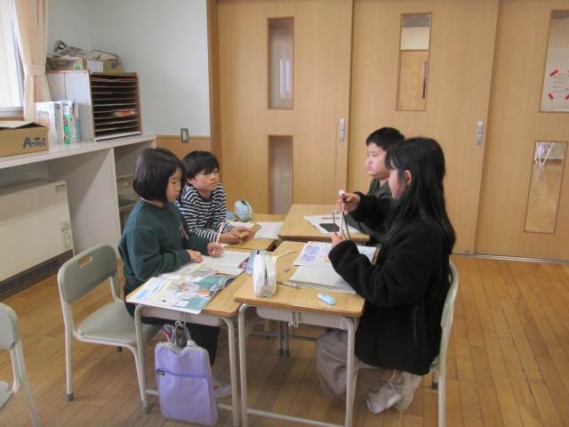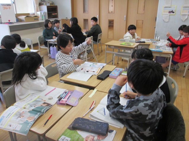 理科では、音についての学習がはじまりました。今日はトライアングルを使って、音が出ている物の様子を観察しました。「水の中に入れたらどうなるかな?」という意見から、急遽水槽を用意して試してみました。子供たちの豊かな発想が学習を深めています。