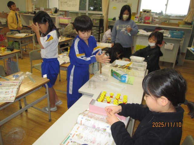 2年生は、うごくおもちゃづくりが始まりました。。持ってきた材料で、ブーメランやぴょんコップなど、思い思いにつくっていきます。また、自動車のタイヤにペットボトルのキャップを使っている人たちは、用具を使って上手に穴をあけていました。出来上がった物をお試しで飛ばしている人たちもいました。楽しそうです!!