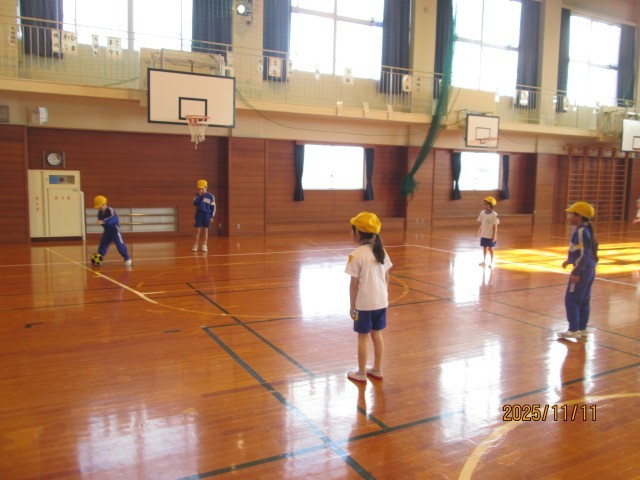 体育の時間に「ボールゲーム」をしました。今日は、グループでボールを運んだり、ドリブルをしながらリレーをしたりと友達と一緒に楽しみました。