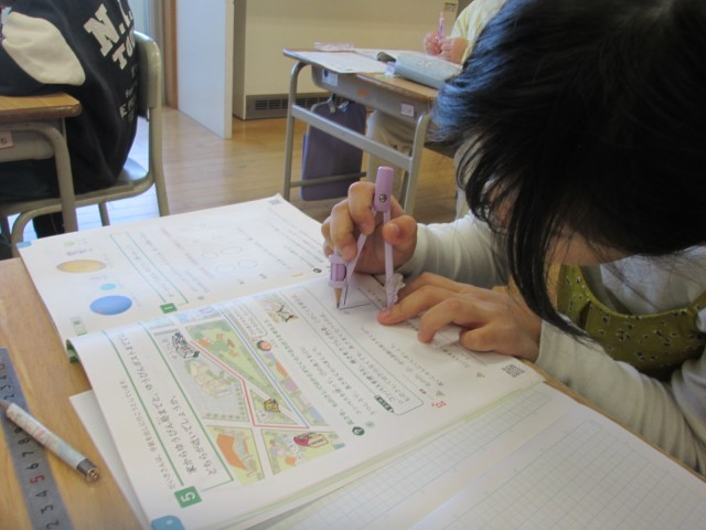 コンパスで円を描くことに慣れてきた3年生。今日は、コンパスを使って、長さを写し取る学習をしました。ものさしがなくても長さが比べられるよさに気づきました。