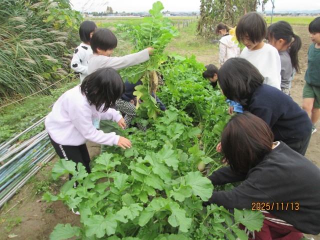9月に植えたダイコンを収穫しました。どれくらい、大きくなっているのかどきどきしながら、引き抜きました。大きさや形は大小様々でしたが、葉っぱが実に見事です。子供たちの喜びいっぱいの写真をご覧ください。