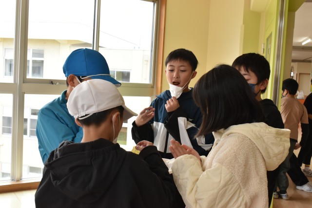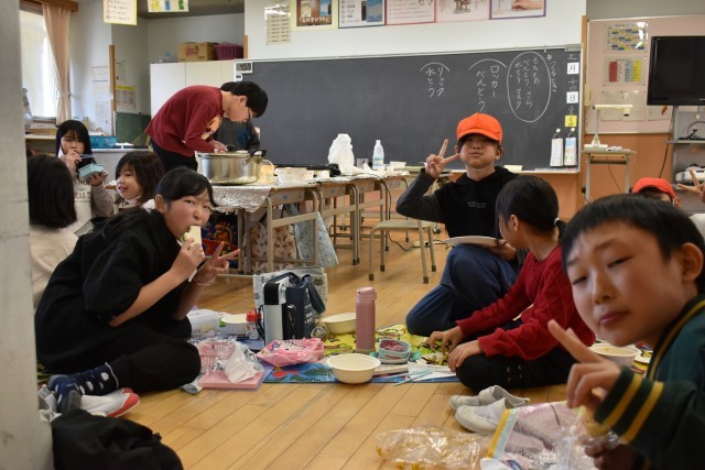 出来上がったおやつと一緒に、調理員の方が作ってくださったさつま汁とお弁当を食べました。秋の味覚をおいしくいただきました。