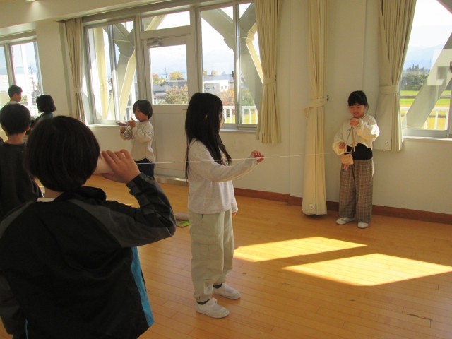 「音が伝わるとき、伝えるものもふるえるのか」について、実験をしました。子供たちの予想から、たこ糸だけでなく、針金やゴムでも実験をしました。伝えるものによって音や震え方が違うことに驚いていました。