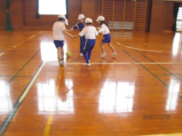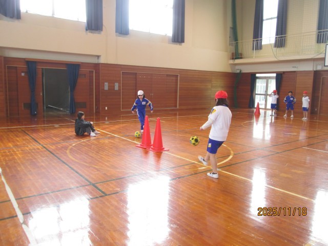 体育では、ボールゲームをしています。グループで協力してボールを運んだり、コーンにボールを当てるリレーをしたりとボールゲームを行いました。ボールのけり方に慣れてきました。